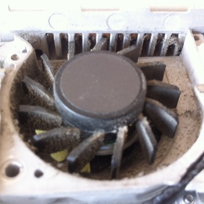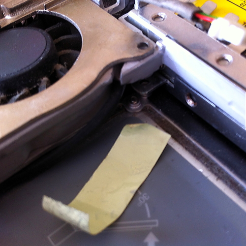 Der Rest ist schnell erzählt: das Notebook wurde geöffnet, der Lüfter war vorhanden, aber blockiert. Von einem Stückchen Klebeband ! Das sich irgendwo im Gerät gelöst hatte. Der gelbe Schnipsel wurde entfernt und das Gerät wieder zusammengebaut. Nach kurzer Zeit begann der kleine Ventilator mit fast 5000 Umdrehungen pro Minute zu rotieren.