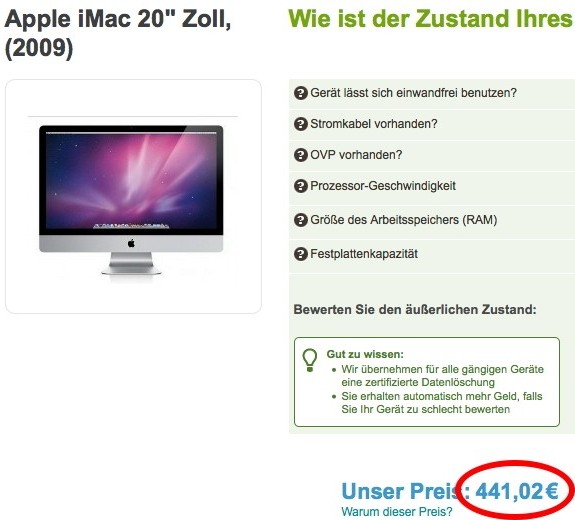 Wie stehts nun beim großen Desktoprechner ? Den iMac mit 20 Zoll-Bildschirm habe ich vor einigen Jahren gebraucht für knapp 700 Euro gekauft und vor kurzem noch mit einer 2-Terrabyte-Festplatte für nachgerüstet. Das Gerät müßte ungefähr 400 bis 500 Euro wert sein. Ich gebe also die Daten ein und bin überrascht, als man mir tatsächlich rund 440 Euro anbietet.