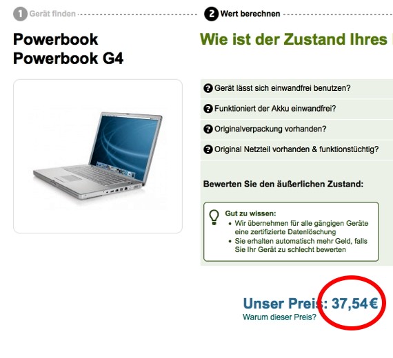 Auch für den dritten Testkandidaten, ein PowerBook G4 mit 12 Zoll Bildschirm, würde ich noch rund 40 Euro bekommen. Sofern der Akku einwandfrei funktioniert. Mit defekter Batterie bekäme ich nur noch den Trostpreis von 50 Cent.